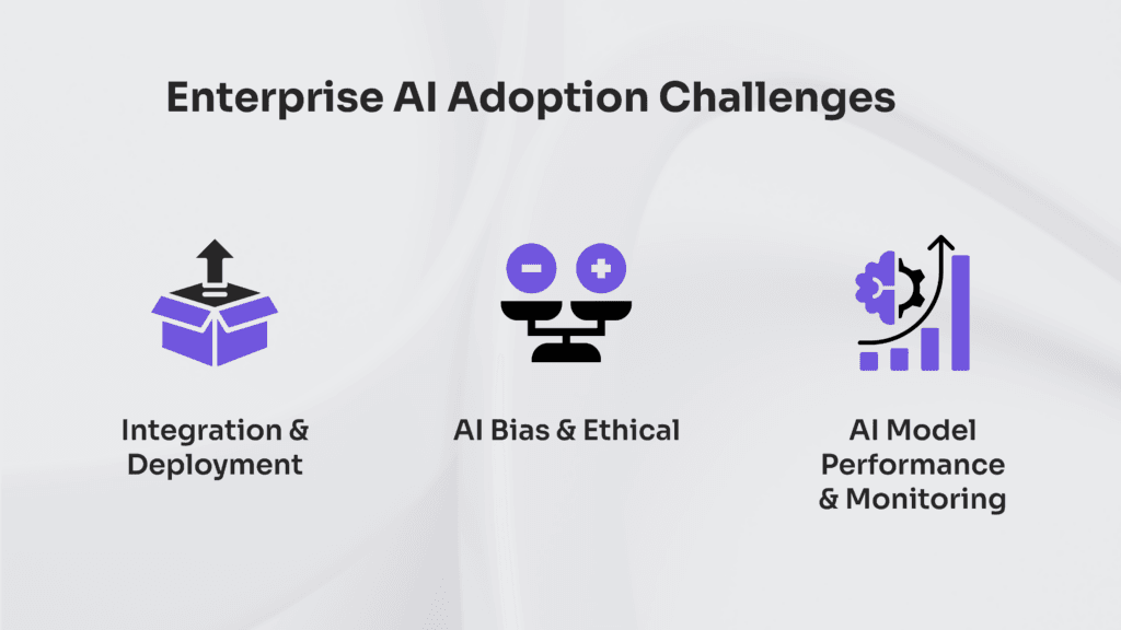 The challenges of enterprise AI adoption include AI integration and deployment, AI bias and ethical concerns, and AI model performance and monitoring.