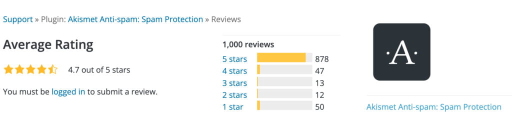 The Akismet WordPress plugin boasts an impressive 4.7 out of 5-star average rating. Out of 1000 total reviews, an overwhelming 878 users have rated it at the highest 5-star level.