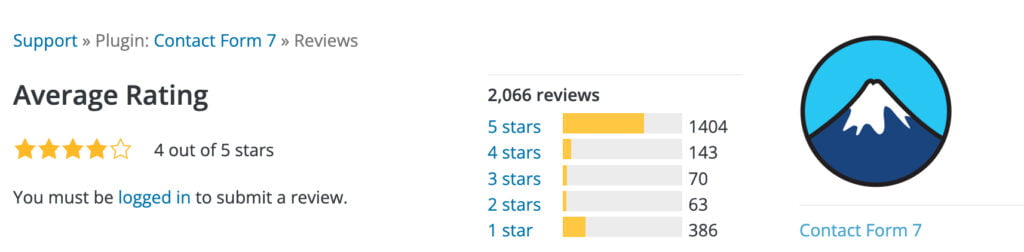 The Contact Form 7 has an average rating of 4 out of 5 stars, based on a total of 2,066 reviews, with 1404 reviews rating it 5 stars.