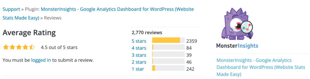 The MonsterInsights WordPress plugin has an impressive Average Rating of 4.5 out of 5 stars. Out of a total of 2,770 reviews, an overwhelming 2359 users have given it a perfect 5-star rating.