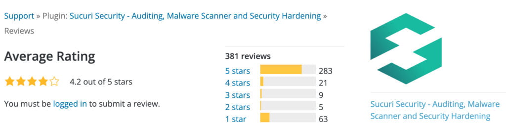 The Sucuri Security WordPress plugin has an average rating of 4.2 out of 5 stars. Out of 381 total reviews, 283 users gave it a 5-star rating.