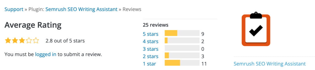 The Semrush WordPress plugin has received an average rating of 2.8 out of 5 stars.