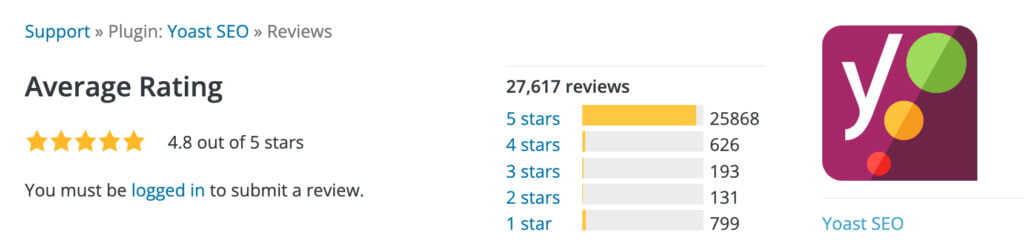 The Yoast SEO plugin has an impressive average rating of 4.8 out of 5 stars, based on a total of 27,617 reviews, with a remarkable 25,868 5-star reviews. Currently, the plugin boasts over 5 million active installations.