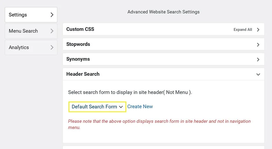 Click Save Form once finished. To add the search form to your site, navigate Ivory Search > Settings and choose whether you’d like to add the search form to the footer or header sections while clicking on Header Search of Footer Search options. In the drop-down menu, click on the search form you’ve just created and save the changes. Open your website to watch the form appear in the header area.