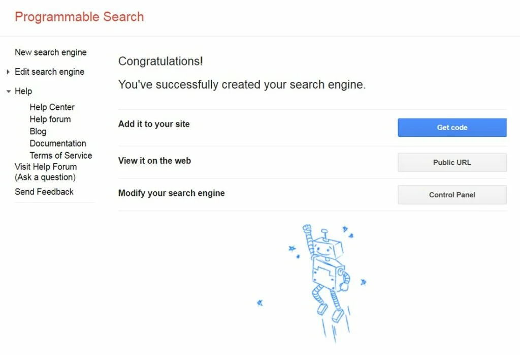You will see a notification that you have successfully created your custom search engine on the next page. You will be offered a choice: add it to your site or get a public link. To add a custom search engine to your WordPress site, click on the Get Code button.