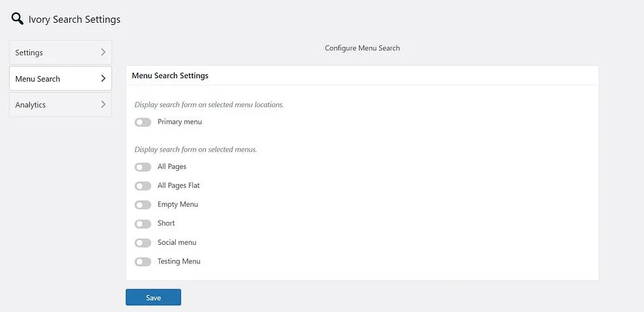 You may also add the custom search form to your website’s menu. To do this, click Ivory Search > Menu Search, and specify the menus where you’d like your custom WordPress search form to show up.