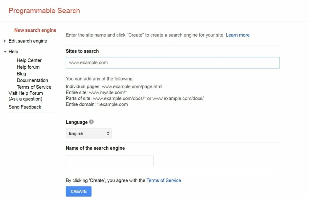 To begin with, go to Google Programmable Search Engine and log in with your Google account. After logging in, click on New Search Engine and specify a link to our WordPress site. This link will also be used as the name of your search engine in the Google Custom Search Engine console. Click on the Create button and proceed to the next step.