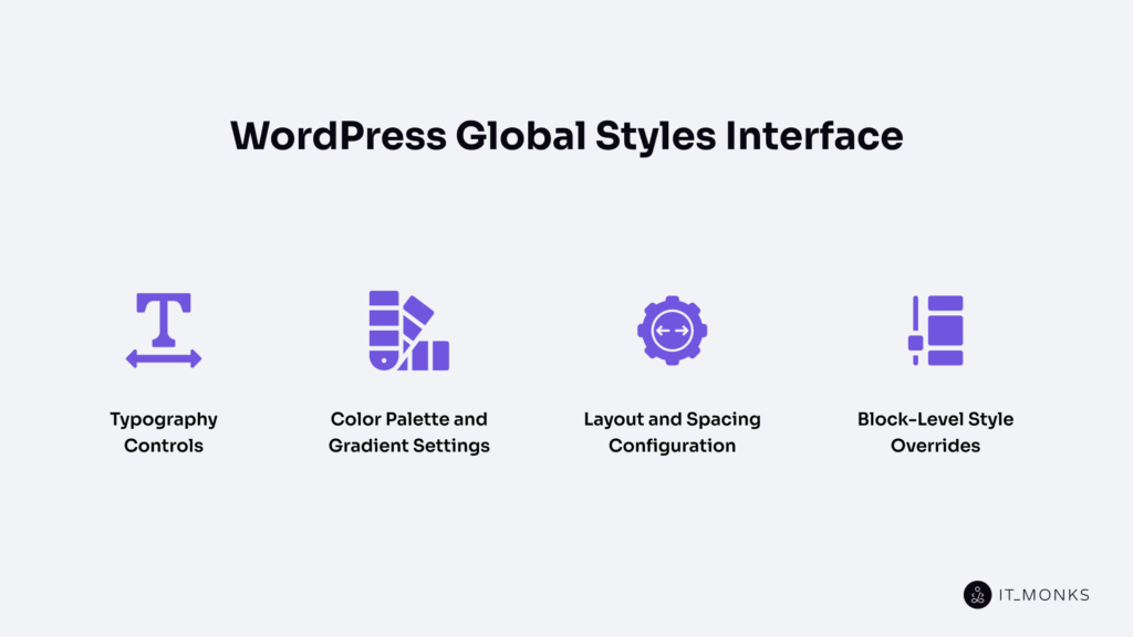 Design consistency across pages. Global Styles enforces shared visual rules across every page, post, and template. A color palette change or typography adjustment applies site-wide automatically, preventing the visual fragmentation that comes from managing styles per-page or per-template.