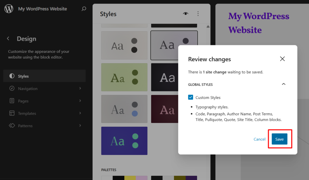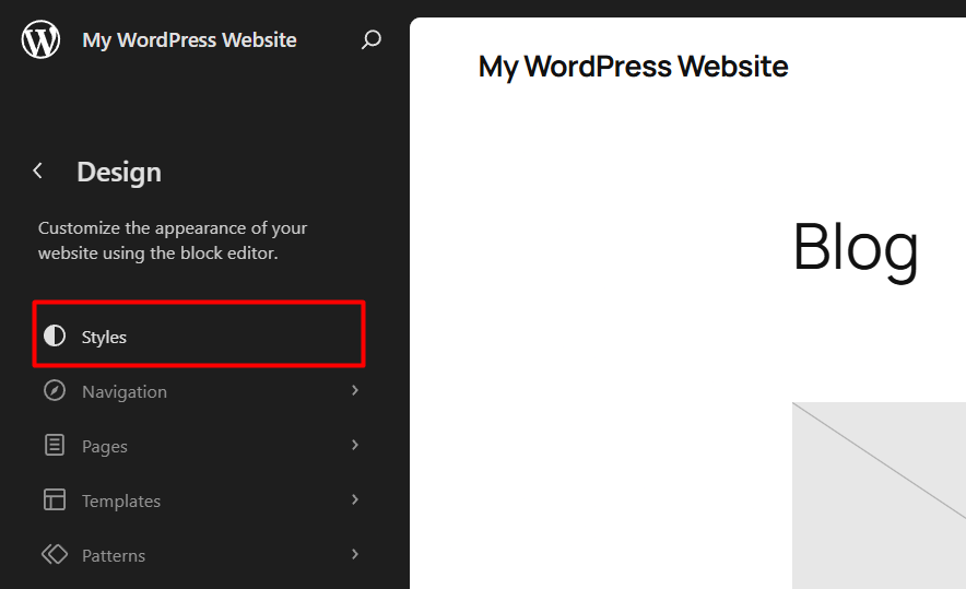 WordPress Global Style Variations are switched directly inside the Site Editor through the Styles panel.