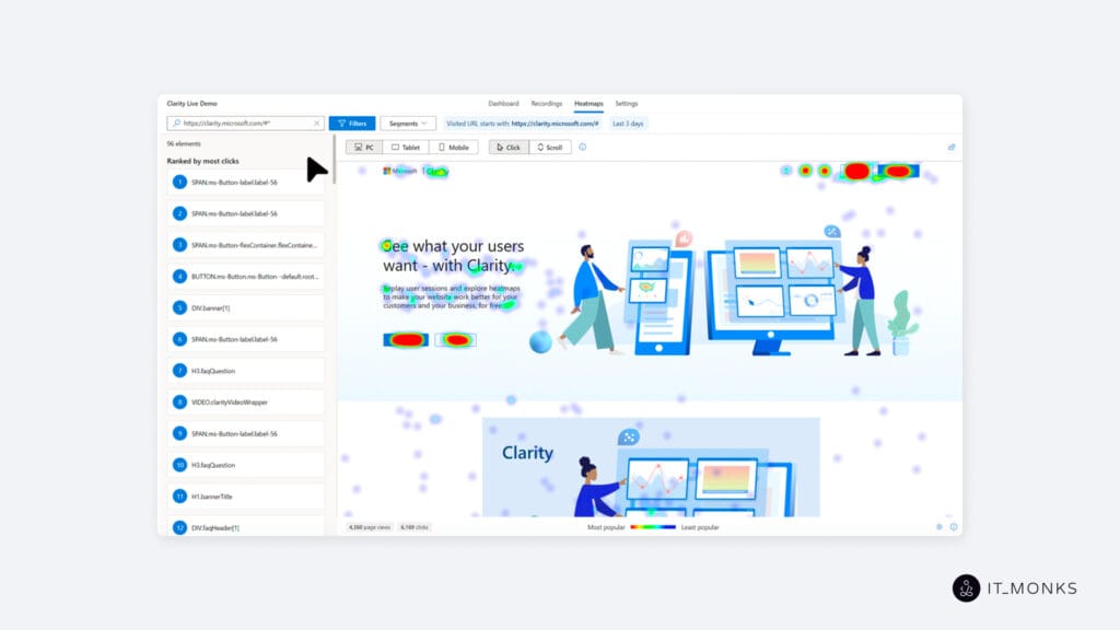By assigning color density to each hotspot, the heat map converts quantitative engagement metrics into clear visual gradients. This allows you to see which elements attract attention, which areas users ignore, and how visitors naturally move through the interface.