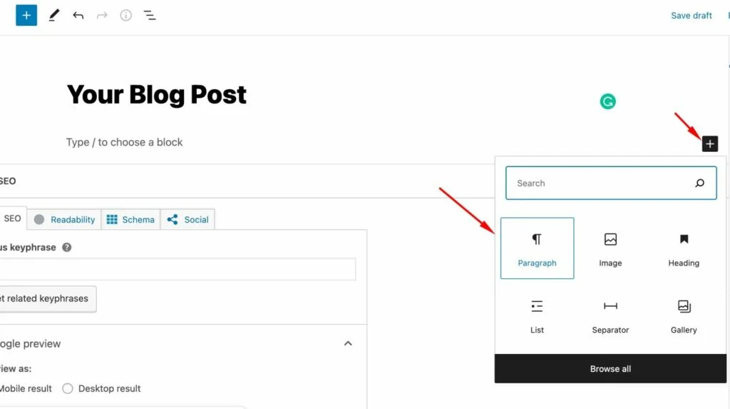 To get started, give a title to your blog post. Right beneath the title line, you can add a paragraph section by simply clicking on the “Enter” button on your keyboard or clicking on the “+” icon in the post editing area.