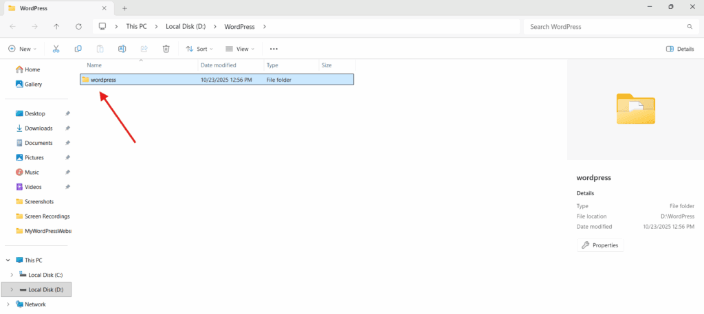 This folder will serve as the root location for your WordPress container environment, storing the docker-compose.yml file and all related configuration data.