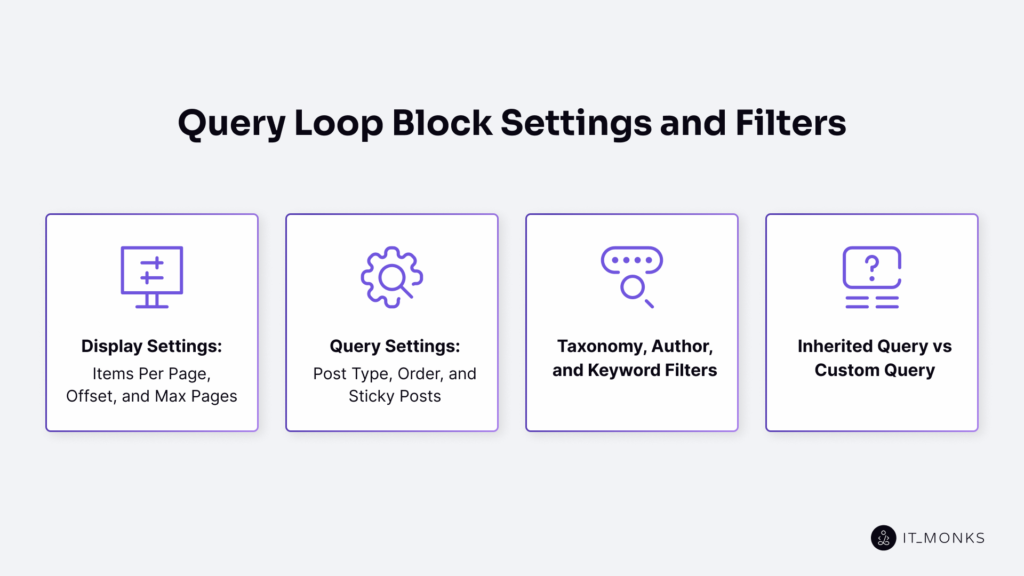 Sub-blocks from the previous section control what content appears in each post’s card. The settings covered here control which posts the query returns, how many appear per page, and in what order they’re sorted.