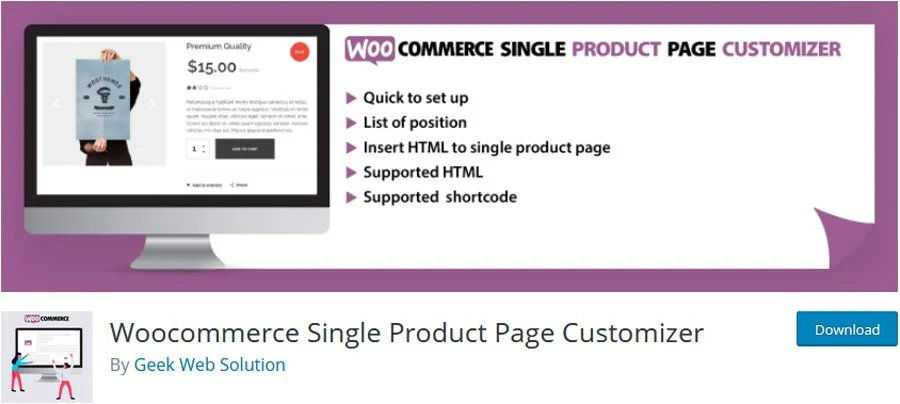 The WooCommerce Single Product Page Customizer is a completely free-to-use WordPress plugin. With its help, you can add text, media, or HTML elements to your Product pages. It includes a visual HTML Editor that allows you to add custom HTML elements to the product pages on your WooCommerce store. The plugin lets you adjust where you would like to add your text – before a single product or its summary, before add to cart button or variants form, etc.