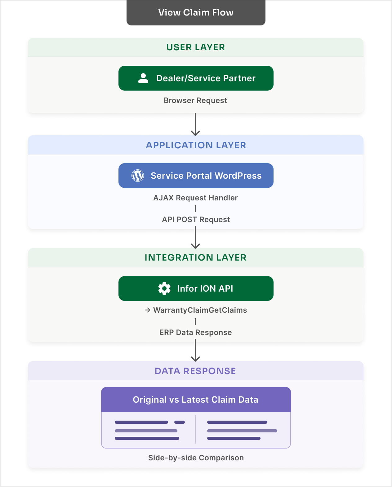 When users access the portal, the browser triggers an AJAX request handled by WordPress, which securely communicates with the Infor ION API to retrieve warranty claim data in real time.