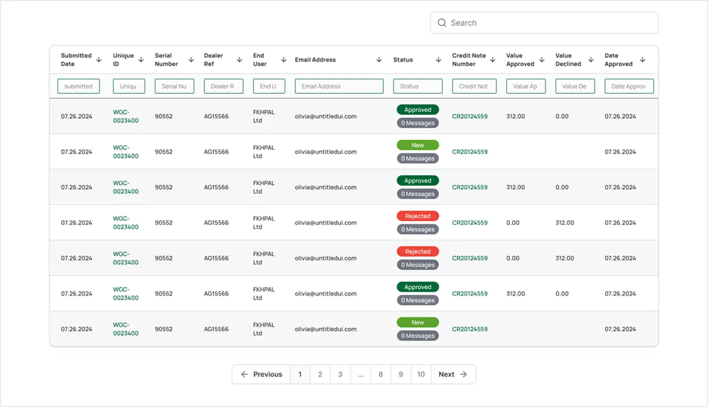 The portal introduces a next-generation data table designed to help service and support teams quickly find the information they need. Advanced column filtering, sorting, and real-time search allow users to instantly narrow down large datasets by serial numbers, dealers, claim status, approval values, and dates.